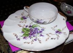 Pretty violet snack set, plate and cup, trimmed in gold. Maker unknown, mfg mark is a crown with the letter "M" over the country of origin, unfortunately I can't read it clearly. Plate measures 7 1/2 inches across. $12.00 plus shipping. |