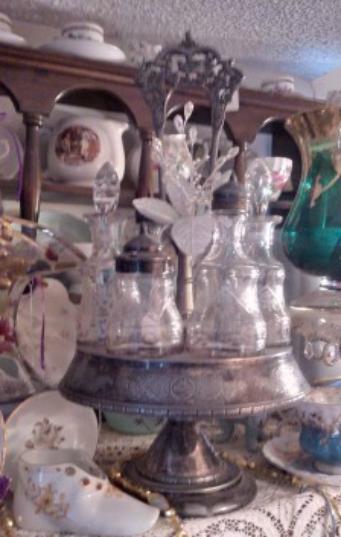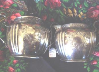 Wonderful Victorian silverplate by KS Silver Co. Electroplate on white metal. #929. Decorated with engraved design of flowers, fluted columns, and detailed band around the rim. Very graceful high handles. In very good condition, has the soft dark old silver patina, where wear just makes a light contrast. Sugar 5 inches high, creamer 4 inches high. Beautiful to display. $32.00 |