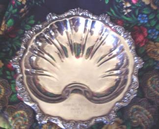 Old English Silverplate by Poole, #5034. Large shell footed dish with ornate design all around rim. Measures 12 inches by 11 inches. Great possibilities as a serving piece or for display. This piece was presented as a championship award, as it is engraved with the following " Vernon Hills Memorial C 2nd Low Net M. Rich 1967." It has a very heavy weight to it. It is in excellent condition. $35.00 plus shipping. |